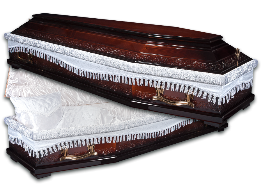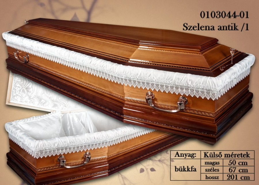 A képeken szerepel a koporsók fantázia neve és az, hogy milyen fából készült.